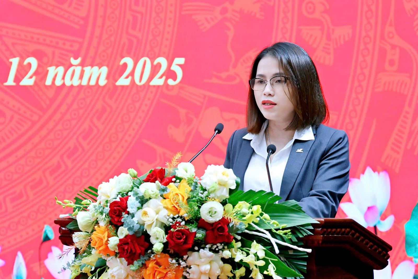 Đồng chí Vũ Thị Châu Giang, Giám đốc Bưu điện tỉnh Ninh Bình trình bày tham luận tại Hội thảo