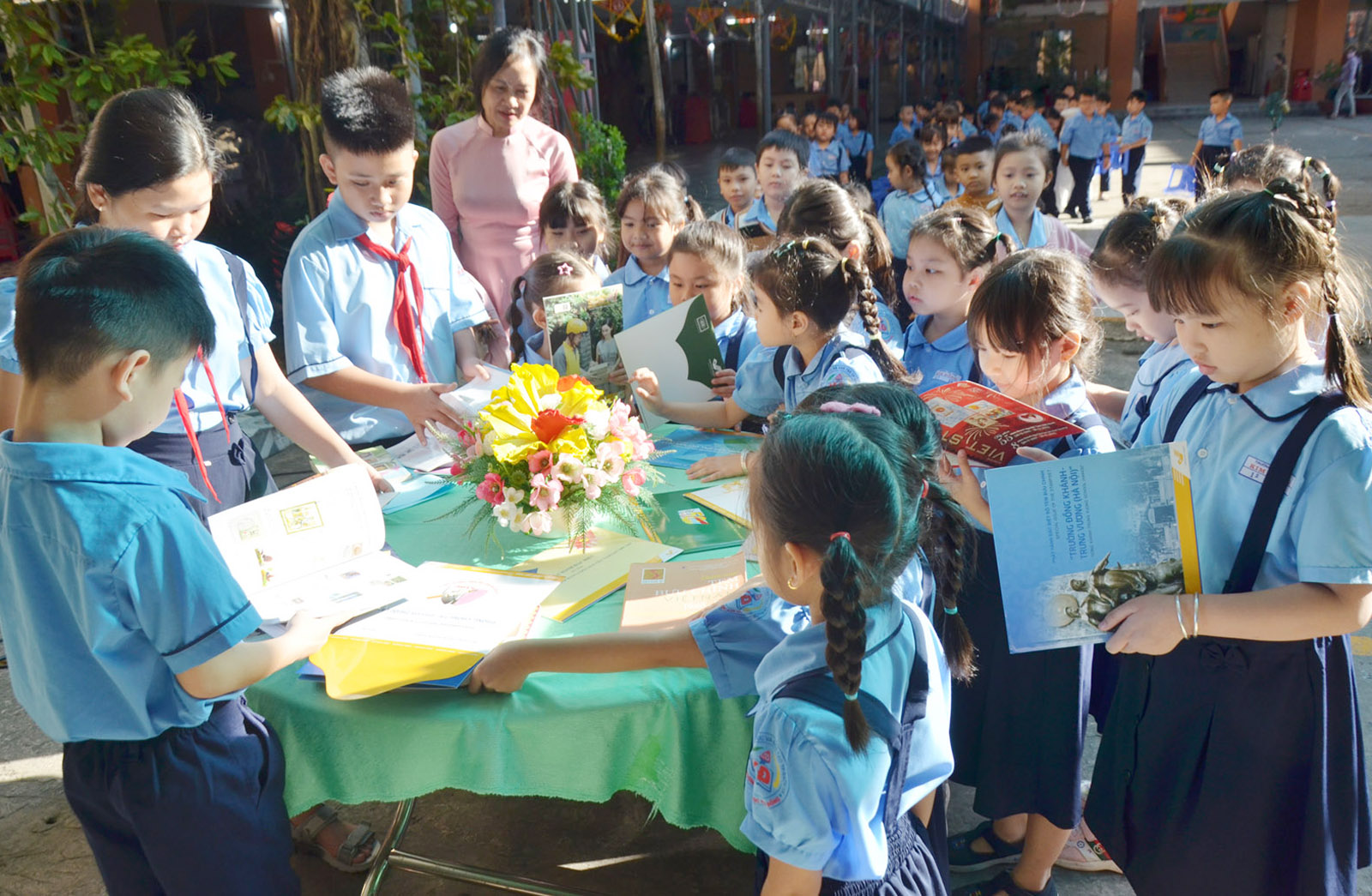 Học sinh Trường Tiểu học Kim Đồng, phường Rạch Giá tham khảo sách hướng dẫn sưu tập tem